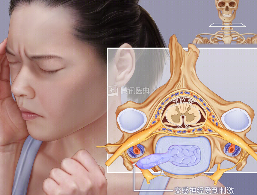患者颈椎退行性变严重,颈椎不稳,影响了颈部的交感神经链,造成交感神经功能兴奋或抑制而出现相应的症状。患者的症状比较复杂:有人出现头痛、偏头痛、头晕、头胀;有人出现视物模糊;有人出现心律不齐、心动过速或过缓、血压不稳定、心慌、胸闷等;还有人出现耳鸣、听力减退甚至全身出汗等。这一类型的颈椎病患者需要排除眼源性、耳源性、心血管源性及神经源性疾病,才能最终确定为交感型颈椎病。交感型颈椎病患者的治疗选择一定要慎之又慎,尤其是选择手术时要慎重。